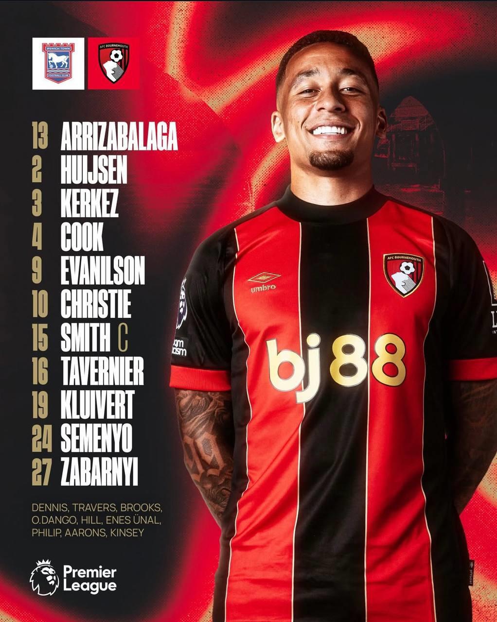 Захисник Борнмута Ілля Забарний в стартовому складі команди на матч 15-го туру АПЛ проти Іпсвіча.