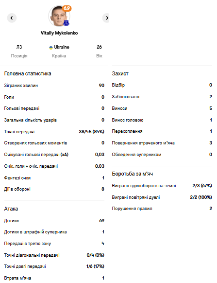 У складі Евертона Віталій Миколенко отримав жовту картку наприкінці матчу за підсумками боротьби з Лукасом Пакета, коли в українець повівся на провокацію бразильця та отримав жовту за неспортивну поведінку.