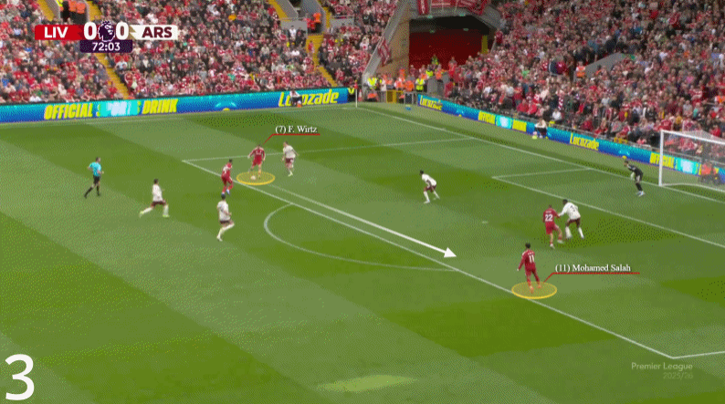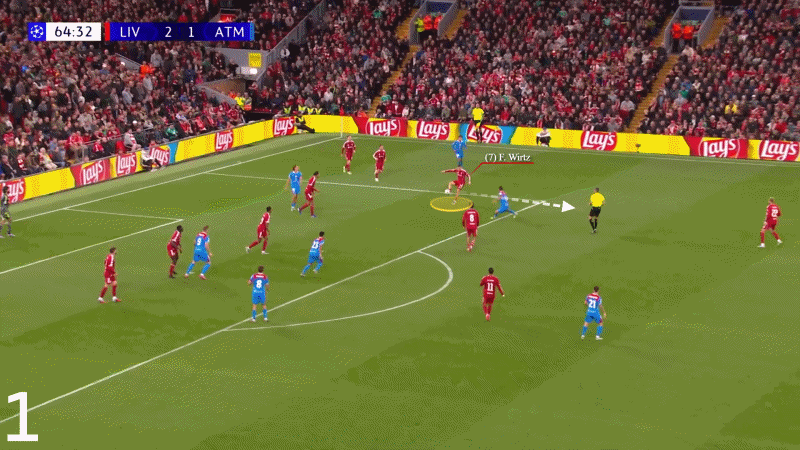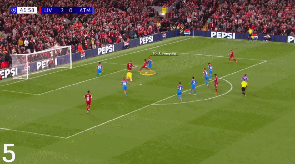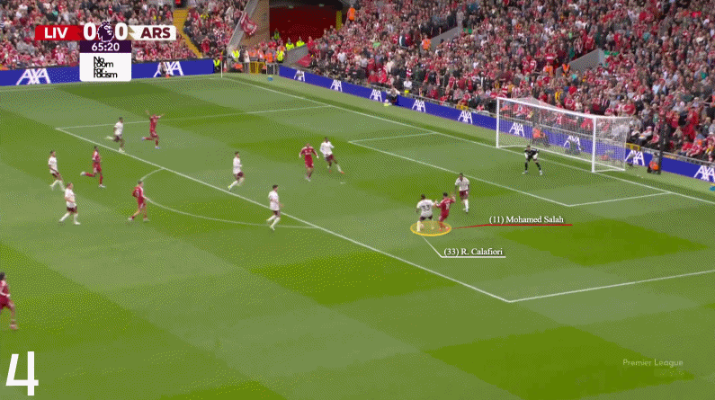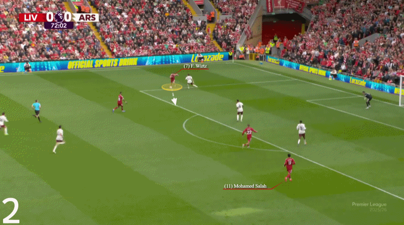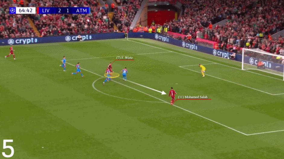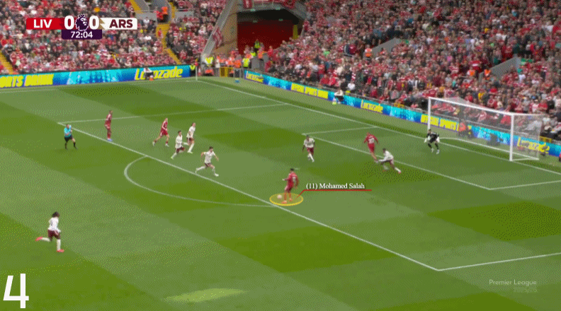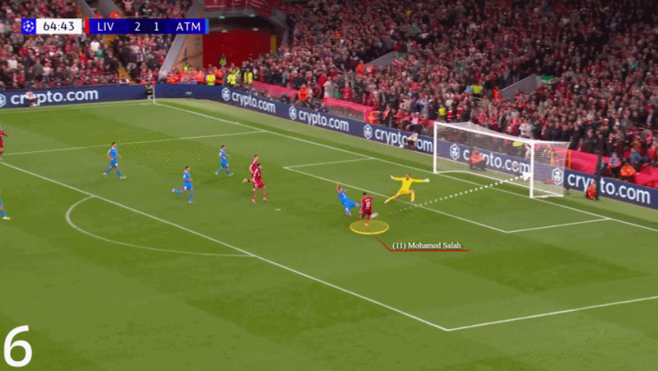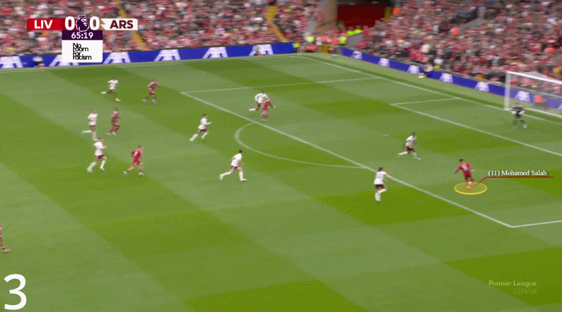 У других таймах проти Арсеналу й Бернлі, а також у матчі з Атлетіко він розкривався, коли міг просувати м’яч уперед у швидких переходах. Двічі проти "канонірів" перспективні атаки зникли через невдалі дотики Салаха — як ось тут…