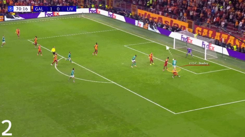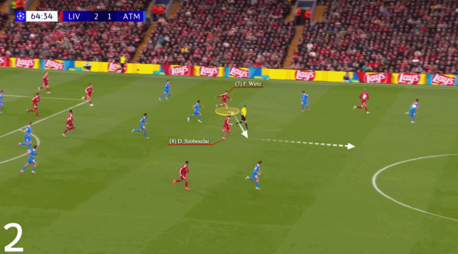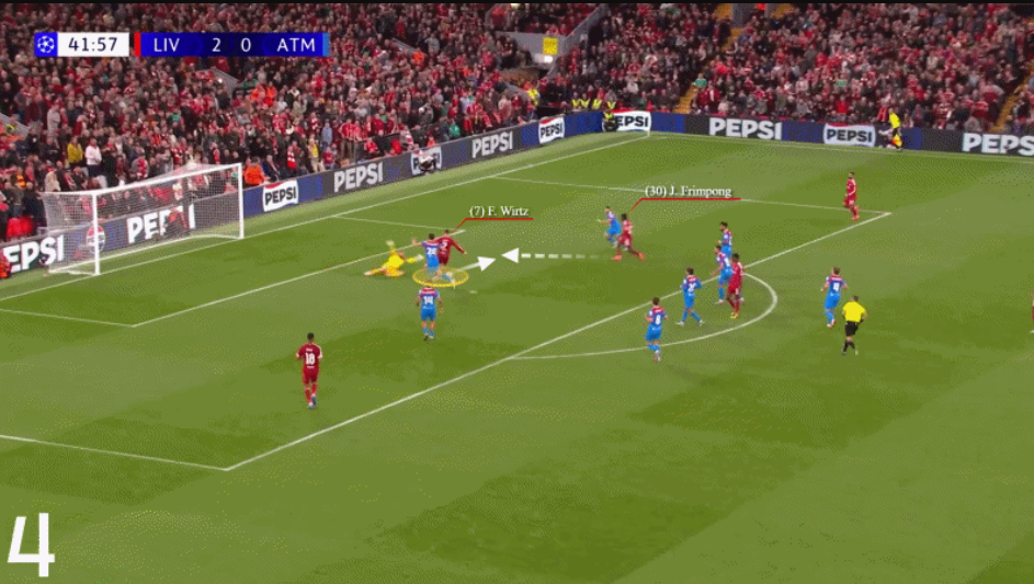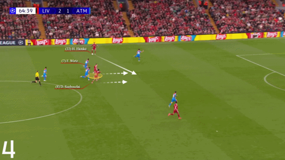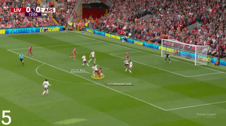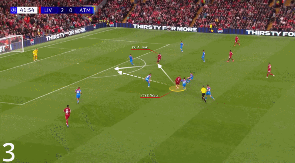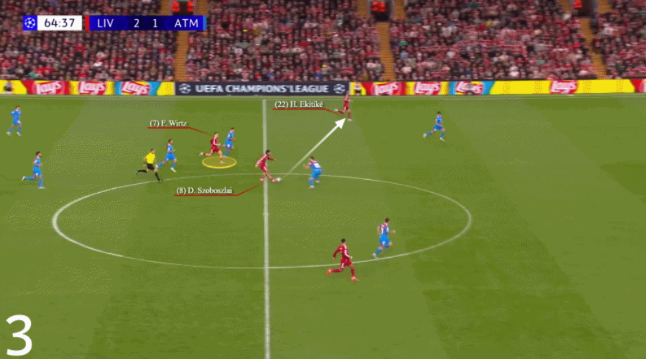 У других таймах проти Арсеналу й Бернлі, а також у матчі з Атлетіко він розкривався, коли міг просувати м’яч уперед у швидких переходах. Двічі проти "канонірів" перспективні атаки зникли через невдалі дотики Салаха — як ось тут…