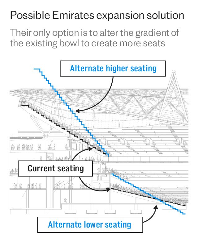 За даними видання, клуб планує збільшити поточну місткість арени (60 700 місць) до понад 70 000, що дозволить перевершити стадіони Вест Гема та Тоттенгема й зробити Емірейтс найбільшим клубним футбольним стадіоном британської столиці.