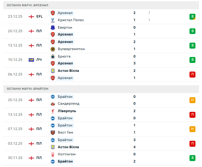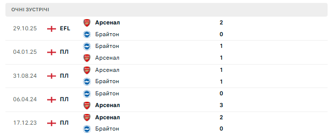 Проблеми Брайтона на чужих полях очевидні: команда регулярно пропускає, а в двох із трьох останніх виїзних матчів взагалі не змогла відзначитися. Поразка 3:4 від Астон Вілли яскраво продемонструвала вразливість команди Фабіана Гюрцелера у відкритому футболі. Водночас історія протистоянь на Емірейтс додає оптимізму гостям — кожен гол Брайтона на цьому стадіоні приносив їм очки, тож інтрига зберігається.