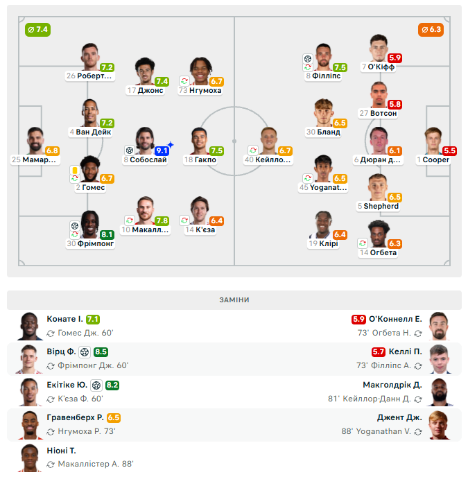 Господарі швидко захопили ініціативу й відкрили рахунок уже на 9-й хвилині — Домінік Собослаї завдав розкішного удару з дальньої дистанції, не залишивши шансів воротарю гостей. У середині першого тайму перевагу Ліверпуля подвоїв Джеремі Фрімпонг, який ефектно змістився з флангу та пробив у дев’ятку.
