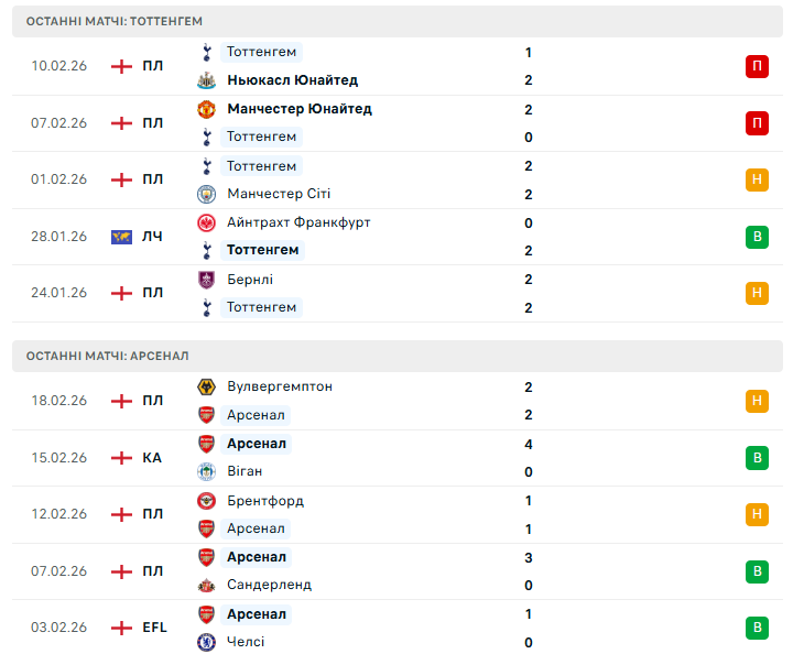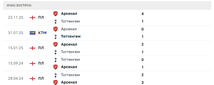 Попри це, Арсенал має вагомі аргументи на свою користь. Команда не програє Тоттенгему у чемпіонаті вже сім поєдинків поспіль, вигравши шість із них, а також тричі поспіль перемагала на полі суперника. До того ж "каноніри" демонструють стабільність у виїзних дербі та загалом залишаються одним із найсильніших колективів сезону, навіть попри певні збої останнім часом.