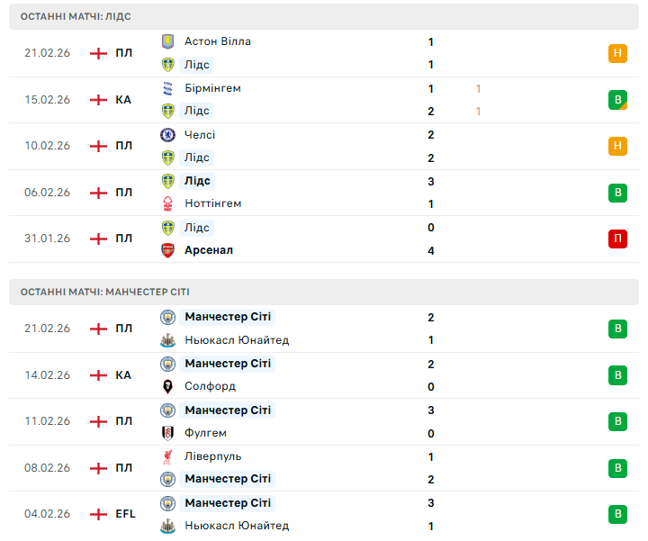 Сіті демонструє баланс між атакою і обороною: лише 25 пропущених м’ячів у 27 турах і 56 забитих. Ерлінг Голанд традиційно небезпечний проти нечужого йому Лідса — норвежець вже оформлював дубль на Елланд Роуд і знову буде головною загрозою для захисту господарів. До того ж "містяни" виграли п’ять останніх очних зустрічей у всіх турнірах, що психологічно грає на їхню користь.
