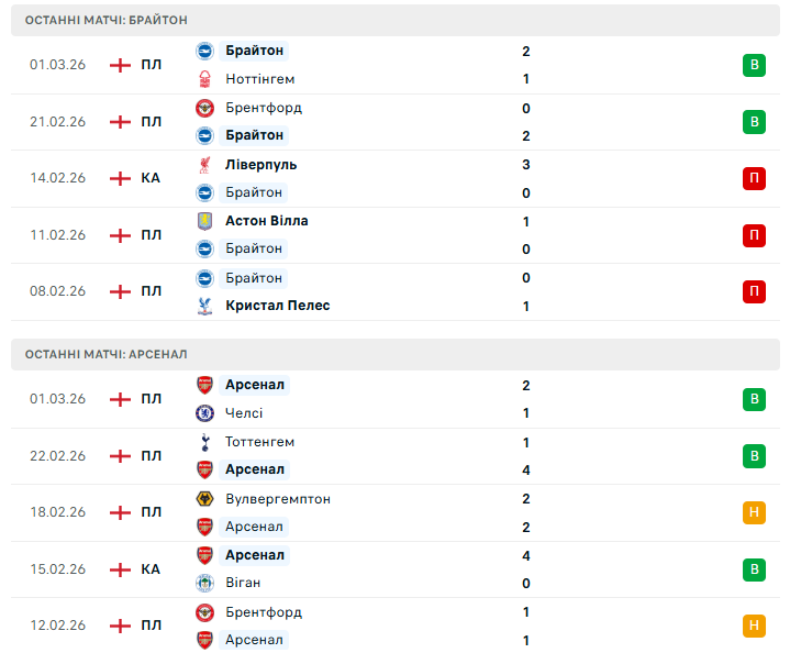 Щодо очікувань, то чекаємо побачити доволі інтенсивний матч: Брайтон намагатиметься продовжити підйом і скористатися підтримкою домашніх трибун, тоді як Арсеналу вкрай важливо втримати темп у чемпіонській гонці. "Каноніри" виглядають фаворитами завдяки стабільності та потужній атаці, однак агресивний стиль господарів може зробити цей поєдинок значно складнішим, ніж здається на папері.