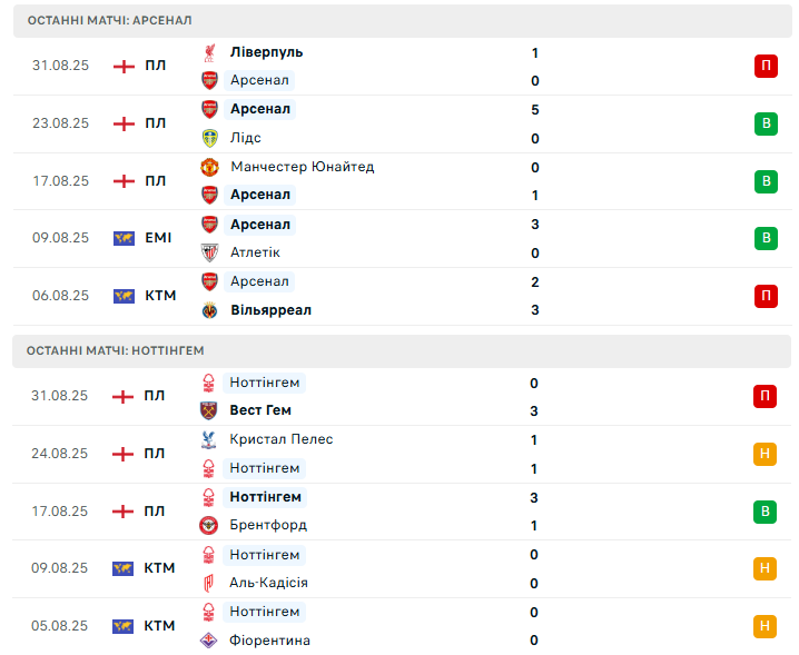 Команда Мікеля Артети впевнено розпочала новий сезон: перемоги над Манчестер Юнайтед (1:0) і Лідсом (5:0) показали, що "каноніри" знову готові боротися за вершину турнірної таблиці. Втім, поразка на Енфілді від Ліверпуля (0:1) оголила старі проблеми Арсеналу у матчах проти топ-суперників. Вдома ж лондонці традиційно відчувають себе значно комфортніше — Форест не перемагав тут із 1989 року.