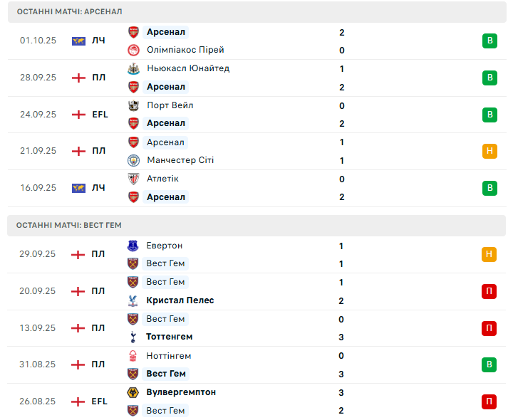 Щодо суперника Арсеналу, то початок сезону виявився справжнім випробуванням для "молотобійців". Серія поразок і лише три очки в перших п’яти турах призвели до відставки Грема Поттера. Новий наставник Нуну Ешпіріту Санту дебютував із нічиєї проти Евертона (1:1), де Джаррод Боуен вкотре підтвердив свій статус лідера атаки. Проте команда й далі залишається у небезпечній зоні — наразі Вест Гем посідає 19-те місце в таблиці.
