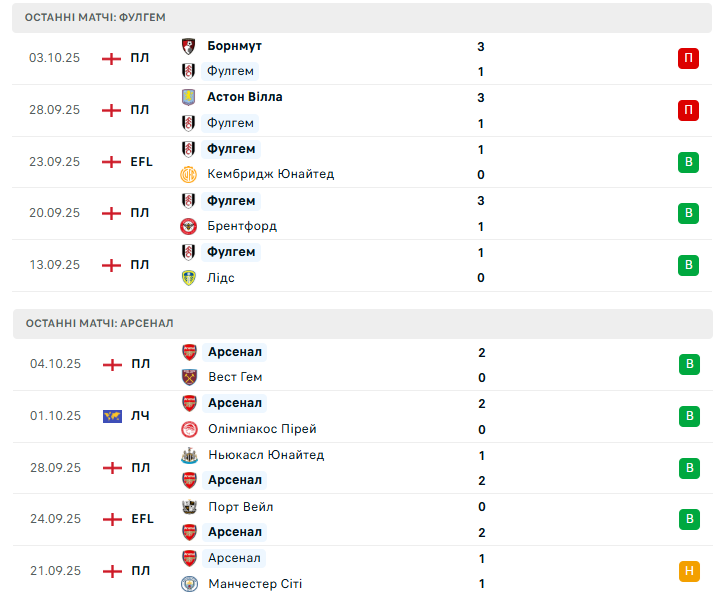 Арсенал Мікеля Артети підійшов до дербі у відмінній формі — чотири поспіль перемоги у всіх турнірах, найкраща оборона чемпіонату і дев’ять різних авторів голів у перших семи турах. “Каноніри” виграли у Ньюкасла, Олімпіакоса, Вест Гема й Порт Вейла, демонструючи глибину складу та впевненість у кожній лінії. Підопічні Артети програли лише одне із останніх 18 лондонських дербі в АПЛ і лише один раз за цей період — саме на полі Фулгема. Але нині “каноніри” виглядають більш зріло, впевнено і прагнуть втримати лідерство, яке здобули перед міжнародною паузою.