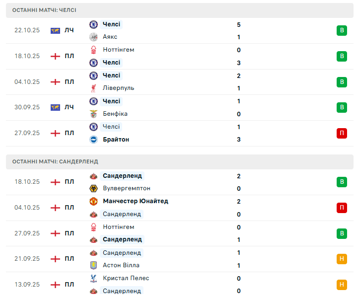 У грі команди відчувається система: Граніт Джака стабілізує центр поля, Мукіеле та Баллард цементують оборону, а Рейнілду повернувся після дискваліфікації. Ле Фе і Ісідор додають швидкості попереду. Сандерленд не програє на виїзді в Лондоні вже 13 матчів поспіль, і це найкраща серія в історії клубу. Водночас проти Челсі історія для них не така прихильна — лише три перемоги у 26 останніх зустрічах.