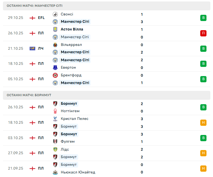 У десятому турі англійської Прем’єр-ліги зустрінуться два сюрпризи осені — поточний чемпіон Манчестер Сіті, який переживає непростий відрізок сезону, та сенсаційний претендент на лідерство Борнмут. Команда Пепа Гвардіоли намагається повернути стабільність після серії невпевнених матчів, тоді як "вишні" Андоні Іраоли вже другий тиждень поспіль утримують друге місце в таблиці.