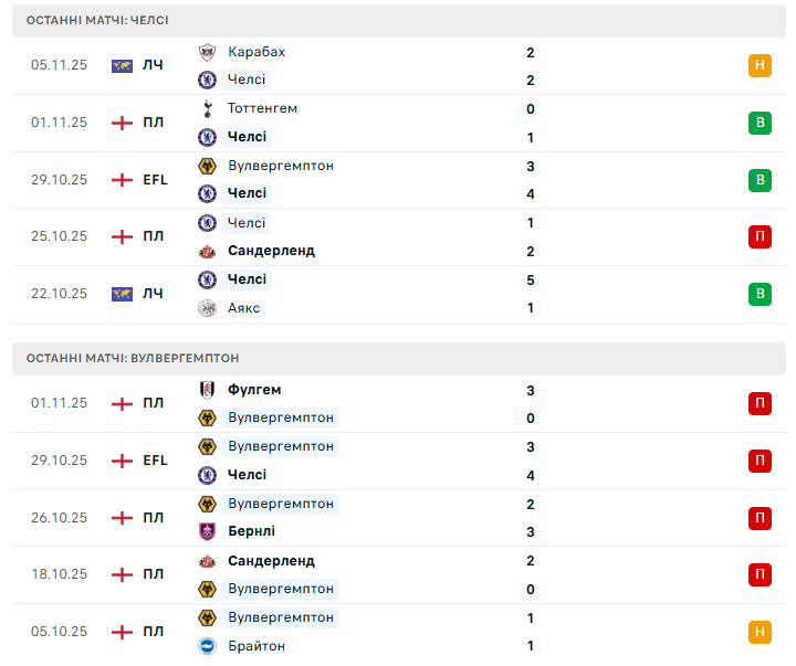 Вулвергемптон програв чотири матчі поспіль із загальним рахунком 1:11 і провів 59% ігрового часу у ролі наздоганяючого — найгірший показник серед усіх клубів ліги. Команда втратила впевненість, структуру і мотивацію. Попри це, нещодавня кубкова дуель з Челсі (3:4) показала, що у "вовків" є характер (ауф) — тоді вони змогли тричі пробити оборону лондонців. Цього разу ключовими будуть стандарти: Челсі пропустив уже понад шість очікуваних голів після подач, і саме тут гості можуть шукати свій шанс.