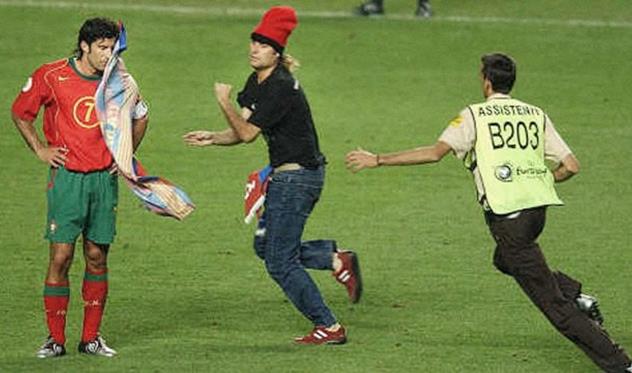 На чемпионате Европы 2004 года фанат Барселоны Джимми Джамп выбежал на поле только ради Луиша Фигу. Болельщик бросил в лицо Луиша флаг Барселоны, с которой он перешел в стан заклятого врага – мадридского Реала.