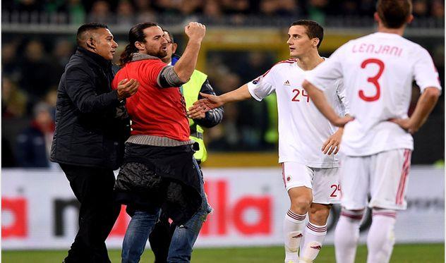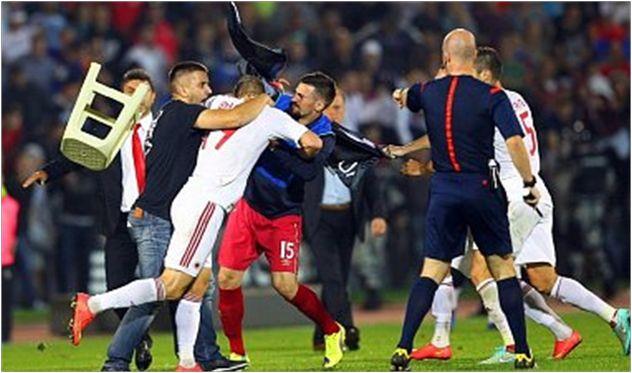 Даже будучи единой страной (Сербия была в составе Югославии) албанцы не сильно ладили между собой, а после обретения независимости между странами началась ‘’холодная война”. Главный камень преткновения – Косово. Сербия по-прежнему считает эту землю своей территорией. В то же время, среди албанских националистов популярна идея "Великой Албании", в состав которой, по их мнению, должны войти и Косово с соседними южными регионами Сербии, и вообще все территории, где проживают этнические албанцы. Именно флаг Шкиперии (Великой Албании) и появился на поле в конце первого тайма. Реакцию сербов можно было понять – защитник Стефан Митрович сорвал полотнище, после чего сразу же на стадионе вспыхнула драка, в которой поучаствовали футболисты обеих команд, официальные лица и игроки, находившихся на скамейке запасных. Повезло, что удалось предотвратить массовое появление болельщиков на поле, но все же один смог прорваться и разбил голову албанцу Балажу пластиковым стулом. Арбитру Мартину Аткинсону можно было ничего не говорить: гости и сами поняли, что пора уносить ноги, а пока они бежали раздевалкам, взбешенные фанаты успели напасть еще на нескольких игроков.