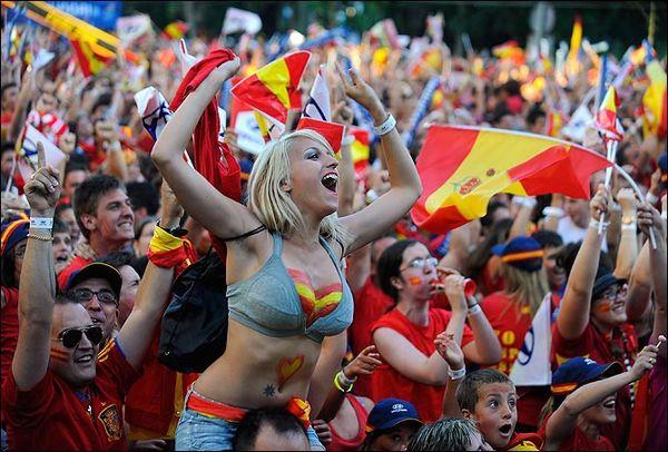 Сейчас испанские болельщики одни из самых ярких на каждом крупном турнире. Испанцы устраивают настоящий карнавал, от головы до пят раскрашиваясь в цвета сборной. А кто не знает легендарного Маноло-барабана?
