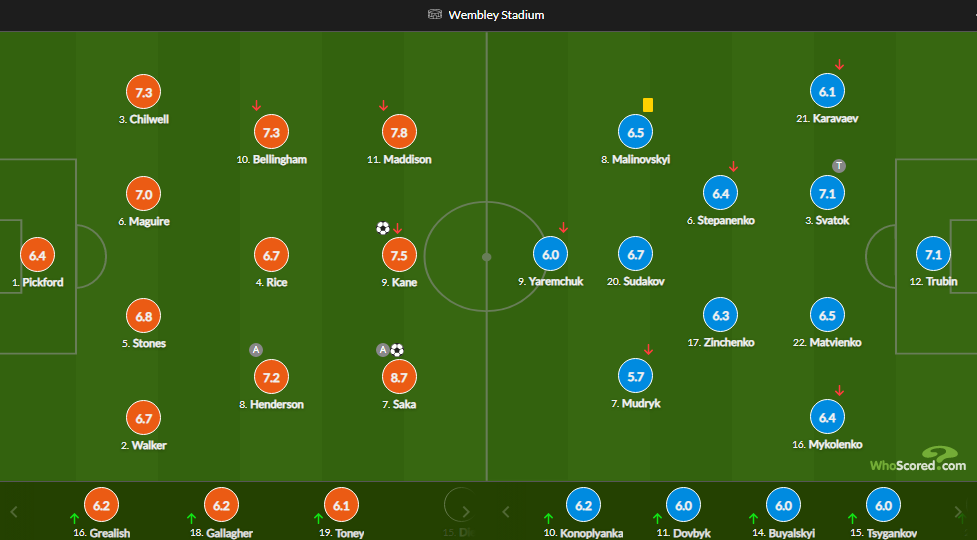 Найкращими у складі збірної України були воротар Анатолій Трубін — 7,1 та центральний захисник Олександр Сваток — 7,1.