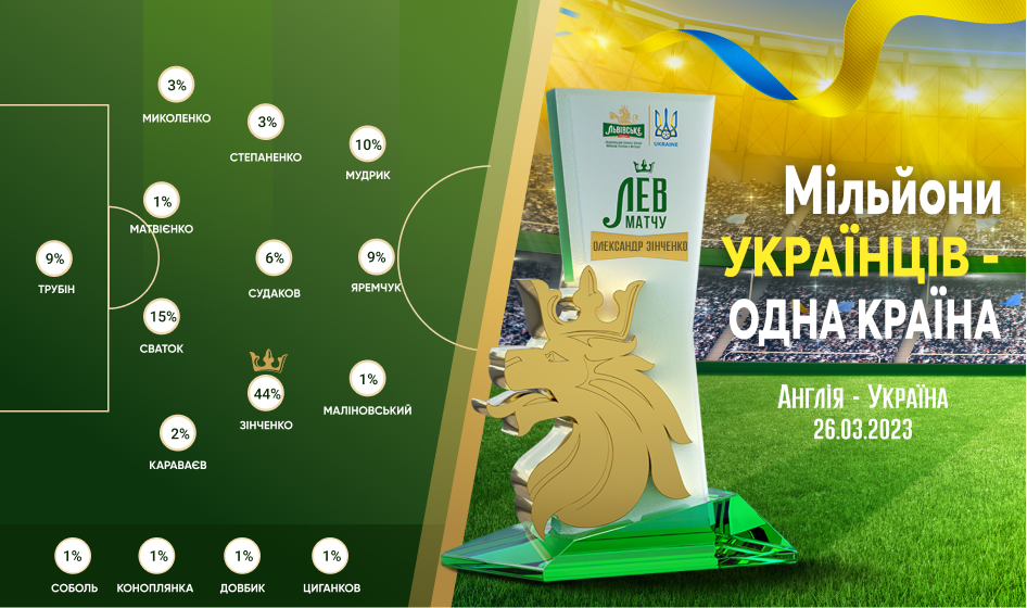 За підсумками голосування за підтримки спонсора збірної України ТМ Львівське приз "Лев матчу" у грі проти Англії отримав універсал нашої національної команди — Олександр Зінченко, який цього разу зіграв у центрі поля, де запам’ятався вболівальникам, передусім, своїм непоступливим характером та намаганням якісно змінити на нашу користь перебіг подій на футбольному полі.