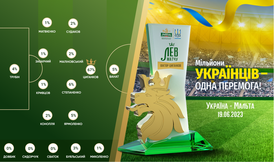 За підсумками голосування за підтримки спонсора збірної України ТМ Львівське приз "Лев матчу" у грі проти Мальти отримав півзахисник нашої національної команди — Віктор Циганков, який цього разу знову спробував себе в змішаній ролі атакувального півзахисника, розташованого ближче до центрального нападника..