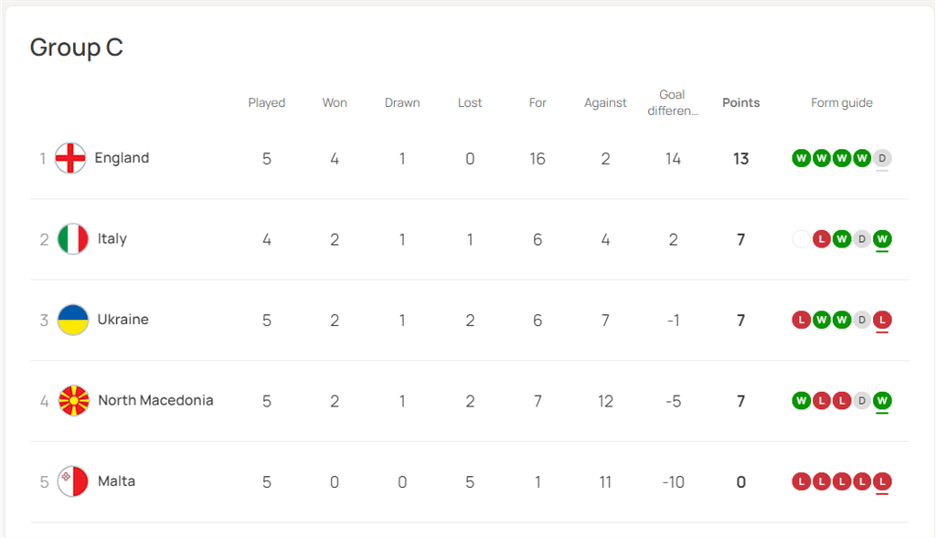 Італія, у свою чергу, за рівної кількості очок із Україною та Північною Македонією змогла піднятися на другу сходинку завдяки перевазі у різниці забитих та пропущених м'ячів.