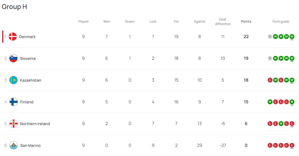 В інших двох матчах групи Н Казахстан впорався із Сан-Марино, а Фінляндія розгромила Північну Ірландію. Турнірна таблиця групи наразі виглядає наступним чином: