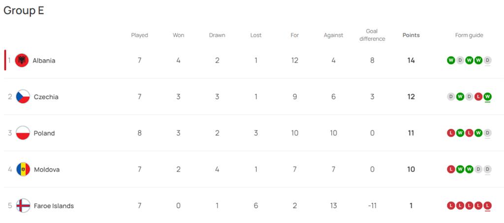 В іншому поєдинку групи Е Албанія не зуміла здолати Молдову, але все одно вийшла на Євро-2024. Турнірна таблиця групи наразі виглядає наступним чином: