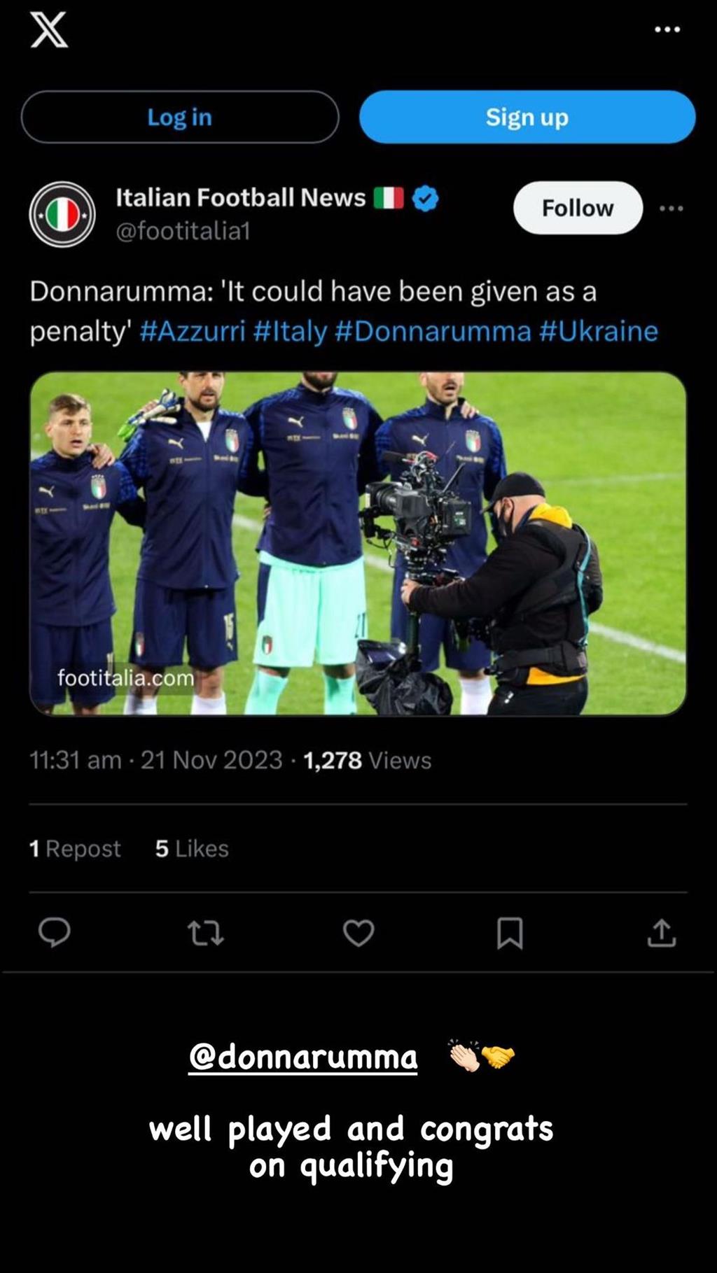 Після матчу Україна — Італія (0:0) у відборі на Євро-2024 голкіпер "Скуадри адзурри" Джанлуїджі Доннарумма прокоментував спірний епізод із падінням Михайла Мудрика у штрафному його команди. Зокрема, воротар припустив, що арбітр мав всі підстави призначати пенальті на останніх хвилинах зустрічі.