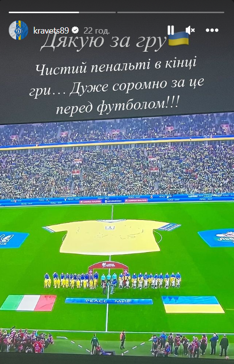 "Дякую за гру. Чистий пенальті в кінці гри... Дуже соромно за це перед футболом!!! Пробачте, але навіть не подивитися... Це жах!!!" — написав Артем Кравець в своєму Instagram.