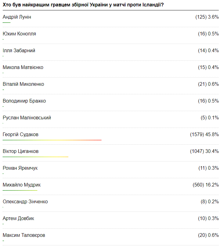 Так, більшість голосів серед усіх учасників голосування набрав атакуючий півзахисник Георгій Судаков, який відзначився двома результативними передачами в моментах із обома голами "синьо-жовтих" та набрав 45,8%.
