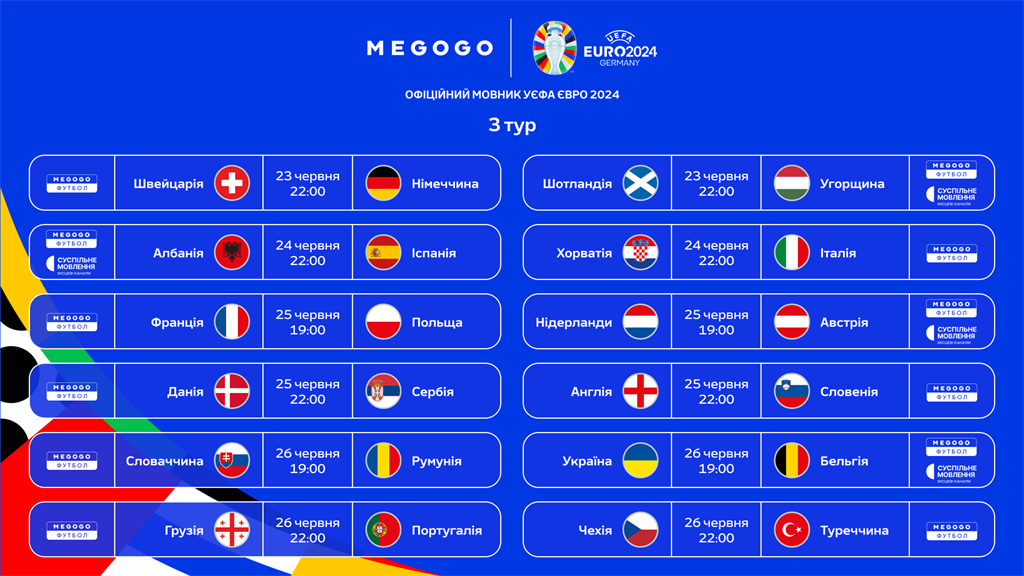 Усі матчі УЄФА Євро-2024 будуть доступні на MEGOGO за передплатою; деталі будуть оголошені незабаром.