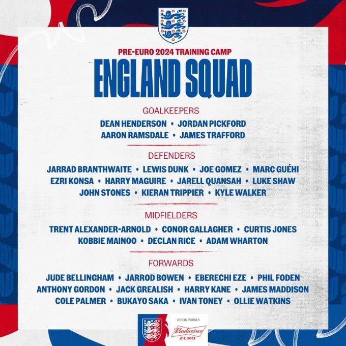 Пресслужба збірної Англії оголосила попередній склад національної команди на чемпіонат Європи 2024.