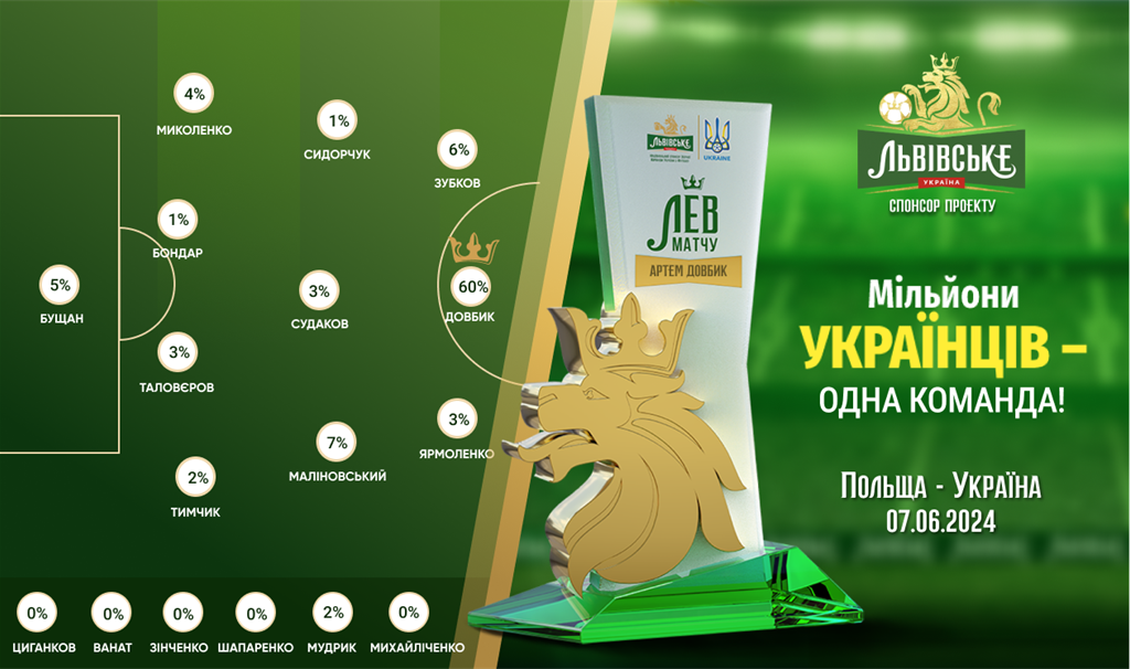 За підсумками голосування за підтримки національного спонсора збірної України, бренда "Львівське", приз "Лев матчу" у грі проти Польщі отримав нападник нашої національної команди — Артем Довбик. Автор єдиного м’яча "синьо-жовтих" — рідкісного виключно приємного футбольного моменту цього вечора, як не крути. Форвард сумлінно виконував свою роботу тоді, коли на табло рахунок постійно збільшувався не на нашу користь і доля за це його винагородила. 76 хвилин на полі у Варшаві, а чи не більшість нашої гостроти за цей час була саме на рахунку Довбика.