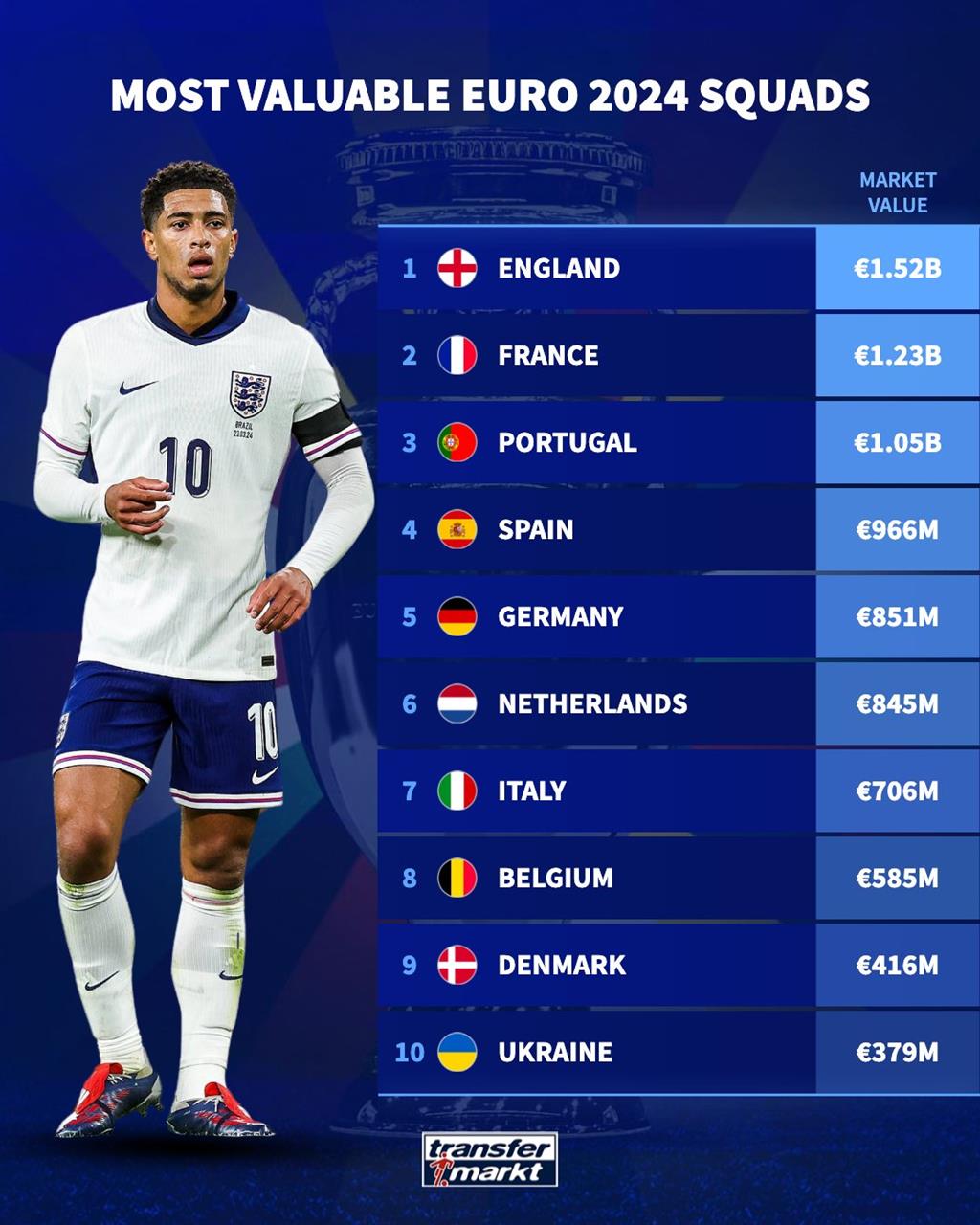 Сукупна ринкова вартість 26 виконавців колективу Гарета Саутгейта становить 1.52 мільярда євро. У розпорядженні спеціаліста перебувають одразу п'ятеро гравців, які оцінюються в 100 млн або вище (Кейн, Райс, Сака, Фоден, Беллінгем).