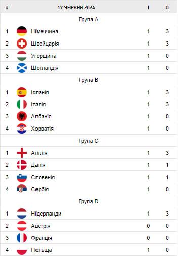 У неділю, 16 червня, у рамках третього ігрового дня першого туру групового етапу чемпіонату Європи-2024 у Німеччині відбулися три матчі.