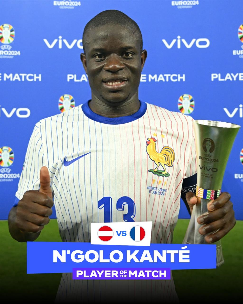 "Він виграв багато м’ячів, заблокував Австрію в центрі поля та здійснив кілька хороших передач вперед. Канте також зробив велику роботу в захисті Франції, залишаючись останнім у важливих моментах", — сказано у вердикті комісія технічних спостерігачів УЄФА.
