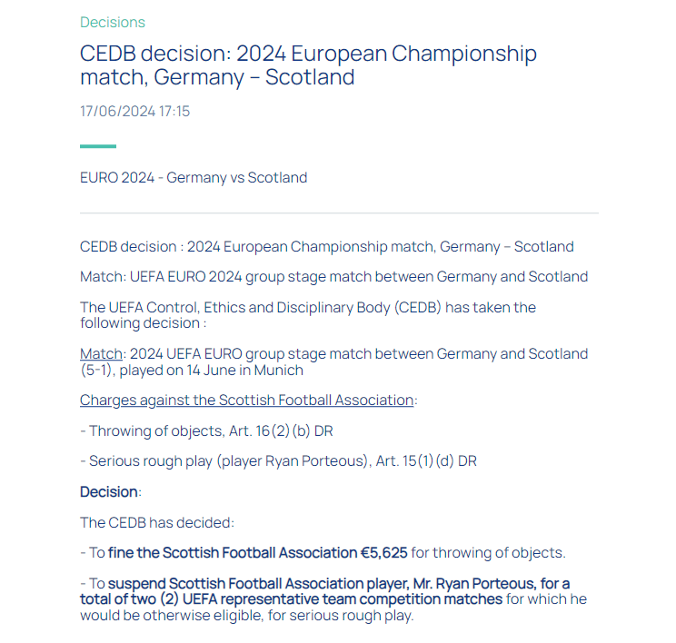 Оригінальний текст дисциплінарного рішення за підсумками гри між Німеччиною та Шотландією: