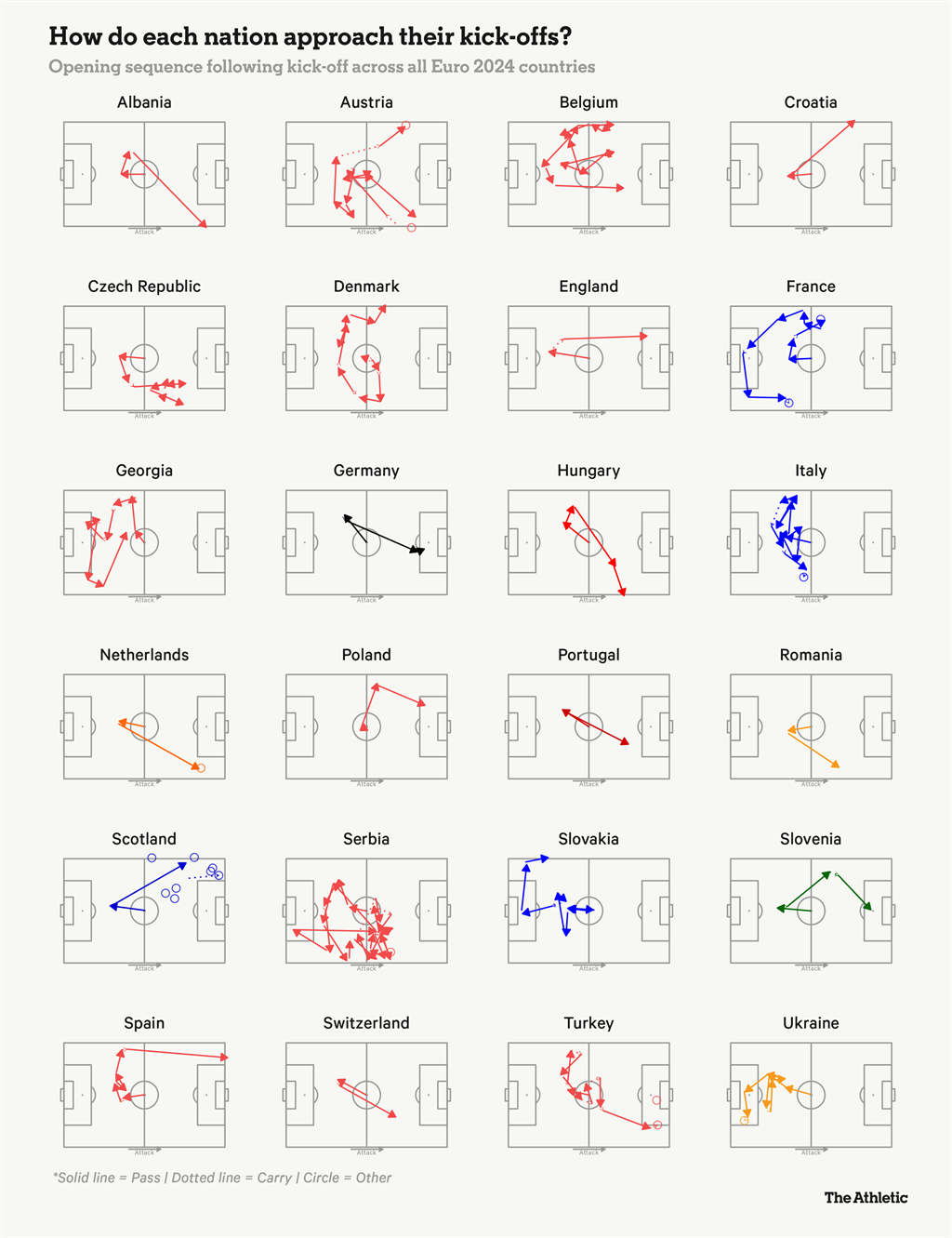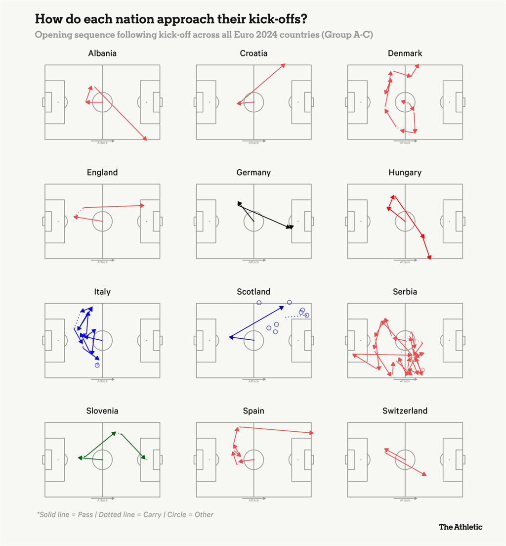 Деякі пішли різними шляхами: Англія звільнила центр поля, коли Джордан Пікфорд бив вперед, щоб розіграти м'яч з Гаррі Кейном. П’ять гравців збірної Польщі стояли на дальньому фланзі під час стартового удару проти Нідерландів, але використали це як приманку: Пьотр Зелінські набіг на м’яч і перевів його на інший фланг, а потім сфера пішла вперед. Австрія спробувала витончену процедуру, розігравши коротку комбінацію у центральному колі, перш ніж спробувати перевести м'яч через захисників Франції.