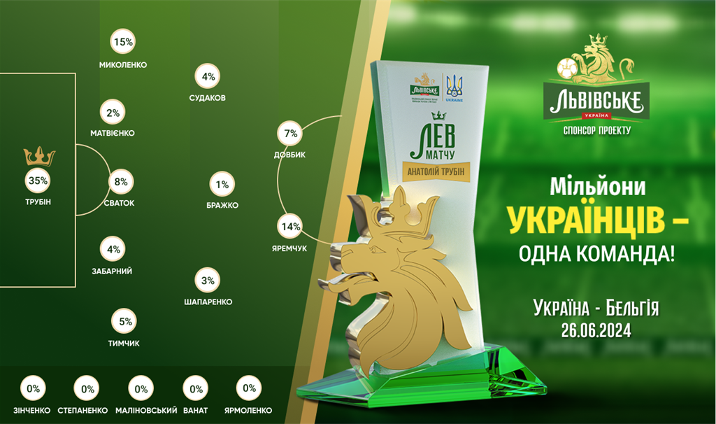 За підсумками голосування за підтримки національного спонсора збірної України, бренда "Львівське", приз "Лев матчу" у грі проти Бельгії отримав воротар нашої національної команди — Анатолій Трубін. Збірна України зіграла "на нуль" проти, як кажуть, третьої команди світу за рейтингом ФІФА, хоча за повідною бельгійців на поле цього й не було помітно взагалі. Це досягнення частково належить саме нашому воротарю, на долю якого цього разу випали пара ударів від Лукаку, небезпечний постріл від Карраско та постійна потреба підчищати відскоки у власних володіннях. Трубін знову став символом надійності, а цього разу ще й удалось партнерів надихнути на таку саму гру.