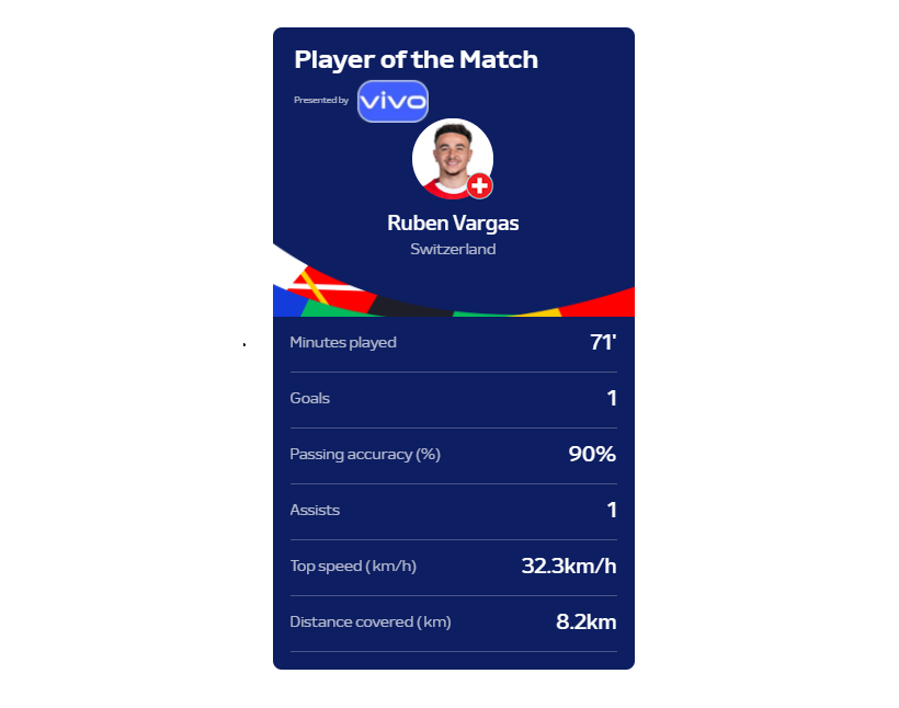 Як повідомляє офіційний сайт УЄФА, найкращим гравцем цього протистояння було визнано швейцарського вінгера Рубена Варгаса, який спочатку записав на свій рахунок асист у моменті з голом Ремо Фройлера, а вже після перерви він відзначився вражаючим голом з дальньої дистанції.