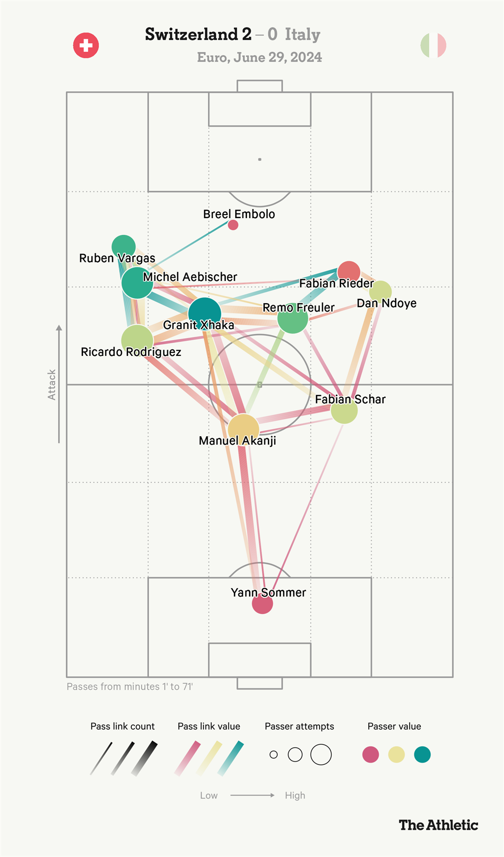Рікардо Родрігес, колишній лівий захисник, відомий своєю здатністю віддавати передачі, не залишається лівим центральним захисником, а натомість робить раптові спринти вперед. Це дозволяє Мішелю Ебішеру, який у 27 років зарекомендував себе як одне з відкриттів турніру, ставати кимось на зразок бонусного №10. І цей рух означає, що Рубен Варгас, лівий форвард, може займати широку позицію або заходити всередину по черзі, завжди дивуючи суперника своїм рухом. Джованні Ді Лоренцо, правий захисник збірної Італії, провів, мабуть, найважчий матч у своїй кар’єрі в програному матчі на груповому етапі з Іспанією (1:0), якого раз за разом проходив Ніко Вільямс. Цей досвід був не набагато кращим, оскільки різні гравці опинялися поруч із ним — зверніть увагу на Родрігеса, Ебішепа та Варгаса, усі знаходяться в просторі, який він мав захищати.