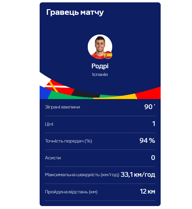 Як повідомляє офіційний сайт УЄФА, найкращим гравцем цього протистояння було визнано іспанського опорного півзахисника Родрі, який на 39-ій хвилині "більярдним" ударом зрівняв рахунок у грі.