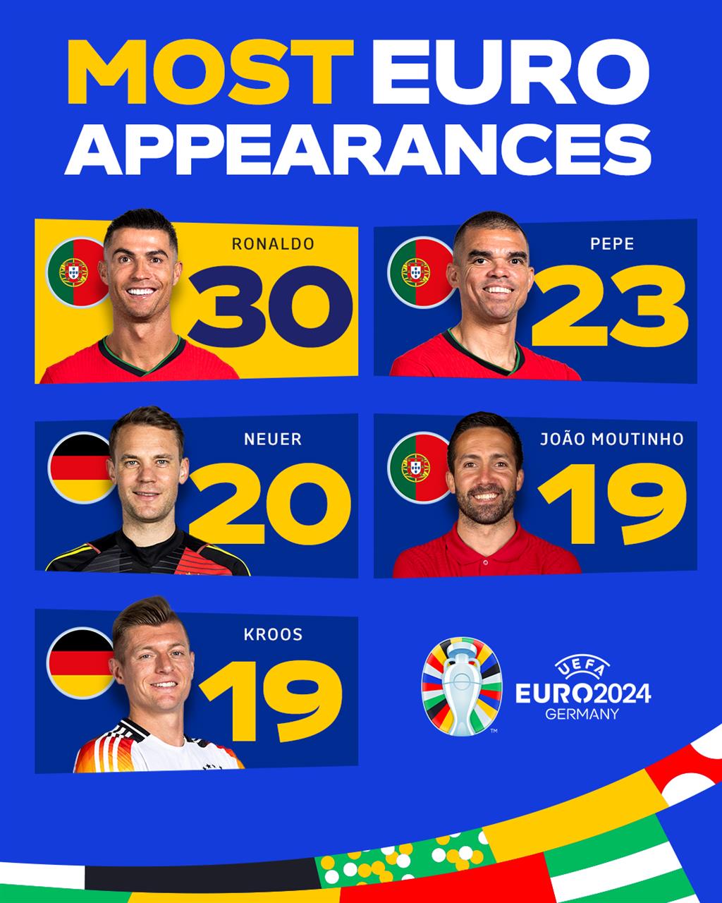 Португалець дебютував на чемпіонаті Європи ще в 2004 році, встановивши рекорд, який протримався до нинішнього турніру. Протягом цих 30 поєдинків 39-річний гравець записав на свій рахунок 14 голів і 8 асистів.
