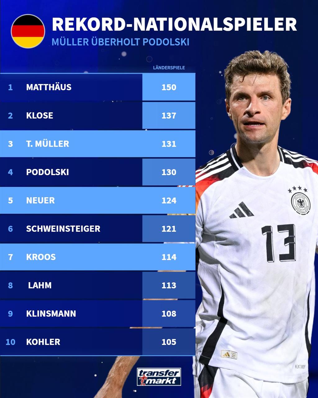 За даними transfermarkt, 34-річний гравець вчора обійшов нападника Лукаса Подольскі за кількістю поєдинків у футболці німецької національної команди. Таким чином, Мюллер опинився в топ-3 цього рейтингу.