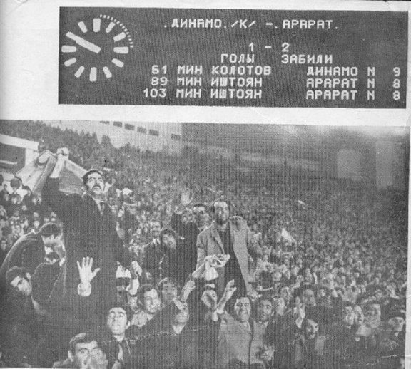 На 61-й минуте легендарный покойный капитан Динамо Виктор Колотов открыл счёт ударом с пенальти, но за минуту до конца игры форвард белых орлов Левон Иштоян сыграл на подхвате и отправил мяч в сетку ворот, тем самым сравняв счёт. Ну а в дополнительное время матча, на 103-й минуте, он принёс армянам победу прекрасным ударом слёту левой ногой. После той игры Сан Саныч Севидов был уволен, а до конца сезона руководить "бело-синими" остался Михаил Михайлович Коман.