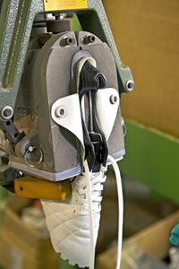 Нижняя часть заготовки зачищается на станке до гладкости, а затем при помощи специального цемента (причем используется цемент разного цвета в зависимости от модели) происходит воссоединение верхней (кожаной или иной) части с подошвой, и все это отправляется под пресс в несколько атмосфер. Вуаля – бутсы готовы!