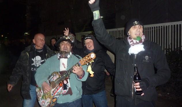 Между фанатами Санкт-Паули и Униона точно нет вражды – перед матчем они свободно и по-доброму общались друг с другом, шутили. Группа из трех местных сначала под гитару спела песню в честь своего клуба, а потом один из них, с крашенной зеленой бородкой, начал выкрикивать: "Union! Union! Sowjetunion…" — при последнем слове громко расхохотался.