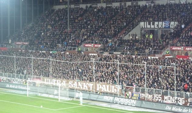 Ультрас привычно находятся на трибунах за воротами. Справа от центральной – болельщики Санкт-Паули, слева – Униона. Трибуны за воротами разбиты на две части – нижнюю и верхнюю. Ультрас "пиратов" расположились на нижней, а сверху – фанаты примерно такой же активности, как и на двух больших трибунах. То есть поддерживают они сильнее, чем обычно принято у неультрас других клубов, но гораздо слабее, чем ультрас.