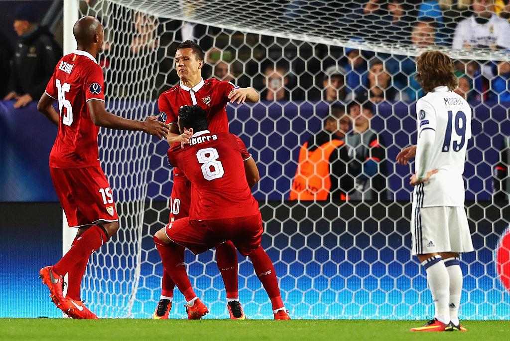 И опять дальше два финала, и опять финал ЛЧ между собой разыграл Мадрид – Реал — Атлетико. На сей раз Атлетико был куда-более близок к заветному трофею – 1:1 в основное время и лишь победа Реала в серии пенальти со счетом 5:3 позволила увезти самый престижный европейский трофей на Сантьяго Бернабеу. А дальше опять Суперкубок УЕФА между опять Реалом и опять Севильей, и опять "сливочные" выиграли, но уже 3:2, тогда один из голов Севильи записал на свой счет Евгений Коноплянка.