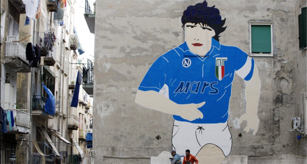Найбільше компліментів лунало на адресу свіжоспеченого короля Неаполя. Ходили байка, що на місцевих виборах, вболівальники зіпсували 20 тисяч бюлетенів. Тіфозі Наполі написали на них "Viva Maradona!" Згідно з іншою легендою, з Сардинії відправили 100 кращих ослів, щоб месія Дієго міг вибрати того з них, на якому в’їде в Неаполь. Один з місцевих умільців сконструював символічний паланкін, в якому на троні сиділа фігура Марадони, до стоп якого припадали Платіні та Румменігге. Коли Дієго грав за Наполі, найпопулярнішими іменами в місті були Дієго та Дієгіта. Кожну четверту новонароджена дитину охрещували на честь футбольного бога. В місті почали перейменовувати вулиці та цілі квартали. Між ними точилися справжні змагання за право носити ім’я святого Дієго. Величезні зображення Марадони прикрашало сотні будинків. Ці мурали підкреслювали божественність Дієго. На одному з них можна побачити аргентинця в обіймах святого Януарія, патрона Неаполя. На жаль, чимало муралів зжер ненаситний Хронос. А стан тих, яким вдалося дожити до нашого часу бажає кращого.