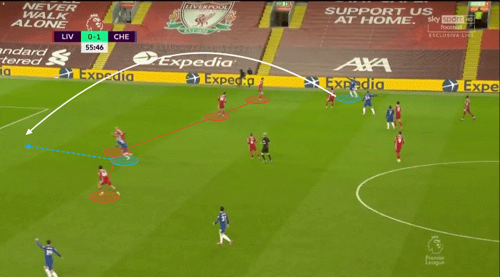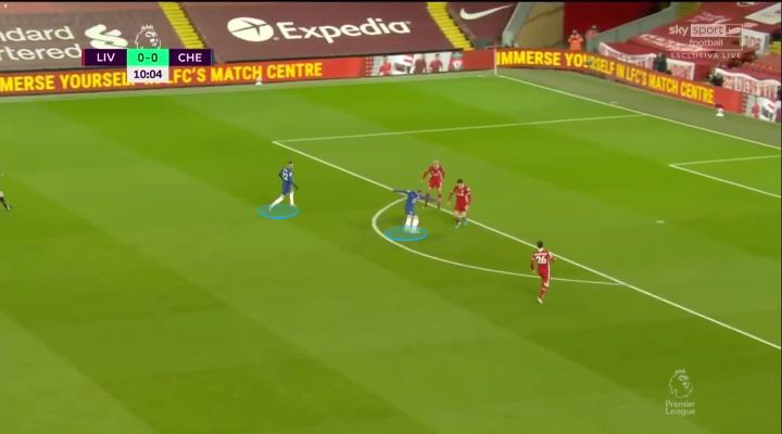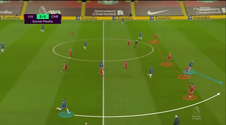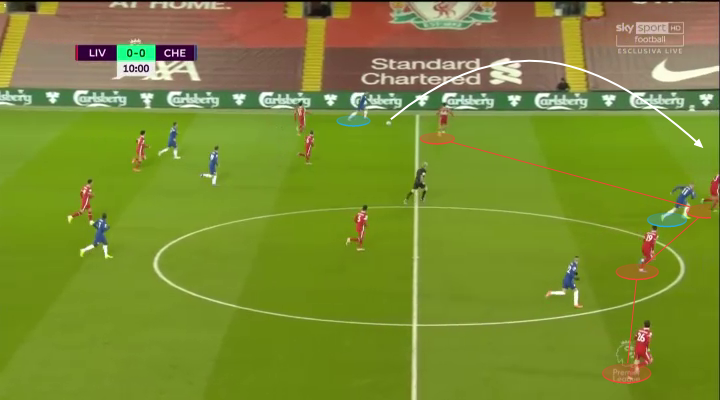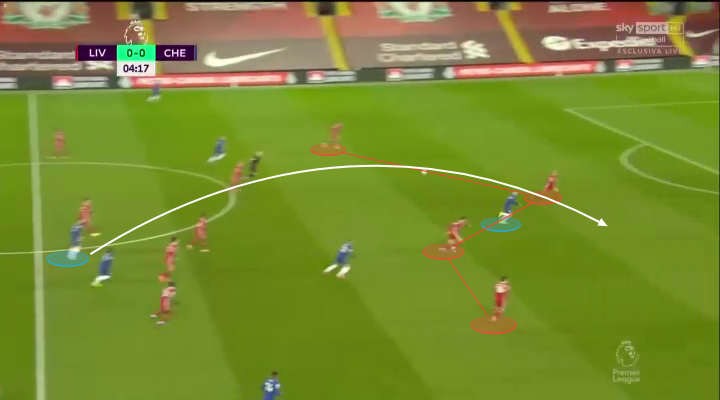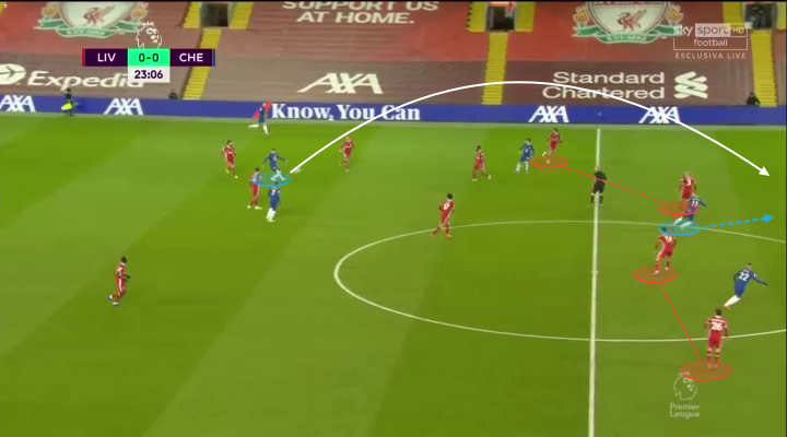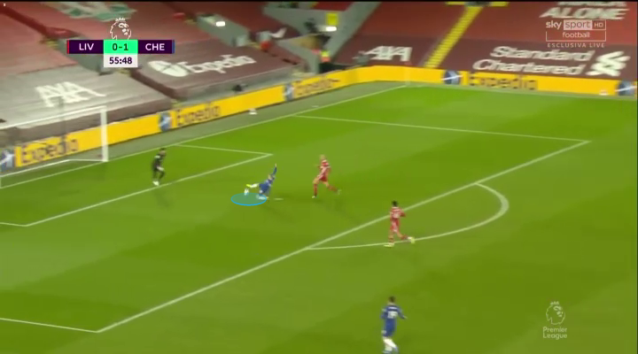 Намерения Челси в недавнем матче, как мы уже выяснили, были ясны с первой минуты. Рис Джеймс имел около 20 метров свободного пространства и спокойно выполнял заброс за спину защитникам Ливерпуля, на открывание Вернера.