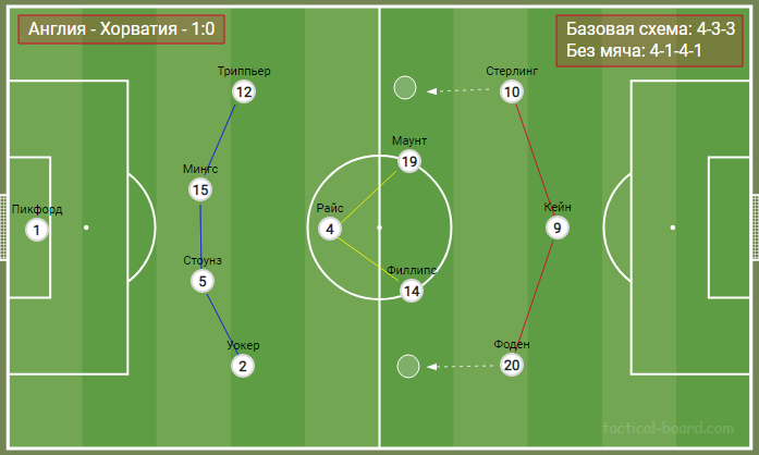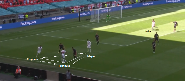 В свой лучший отрезок матча с хорватами, сборная Англии активно задействовала левый фланг. Основными действующими лицами на этом участке поля были Стерлинг, Триппьер и Маунт. Эта тройка часто формировала мобильный треугольник. Игроки активно менялись позициями, регулярно создавая пространство для дальнейшего развития позиционных атак.